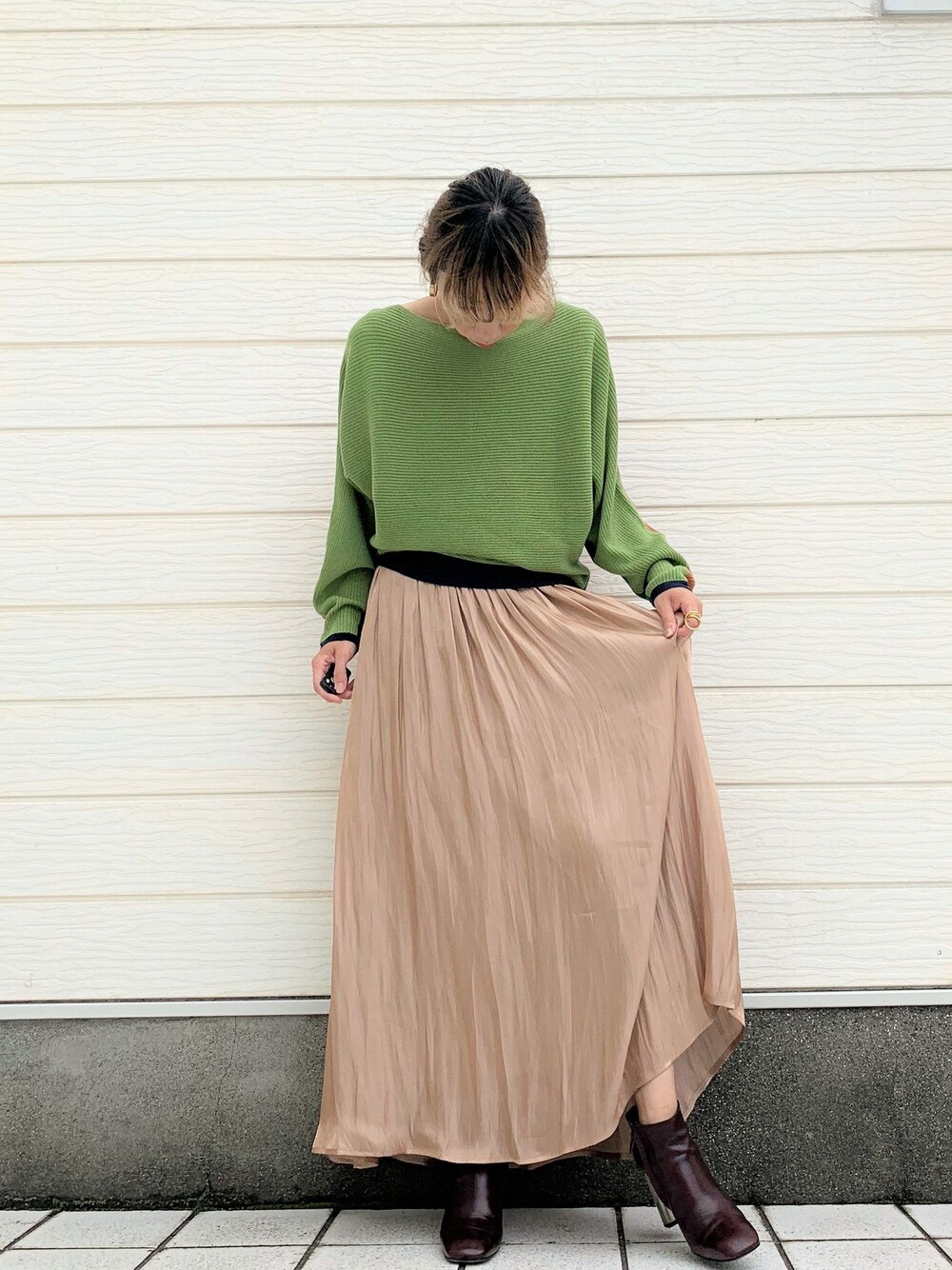 前後で着られる横リブ編みのカラーニット。 秋らしいキャメルのスカート合わせで、この秋挑戦したいカラーコーディネートに♪