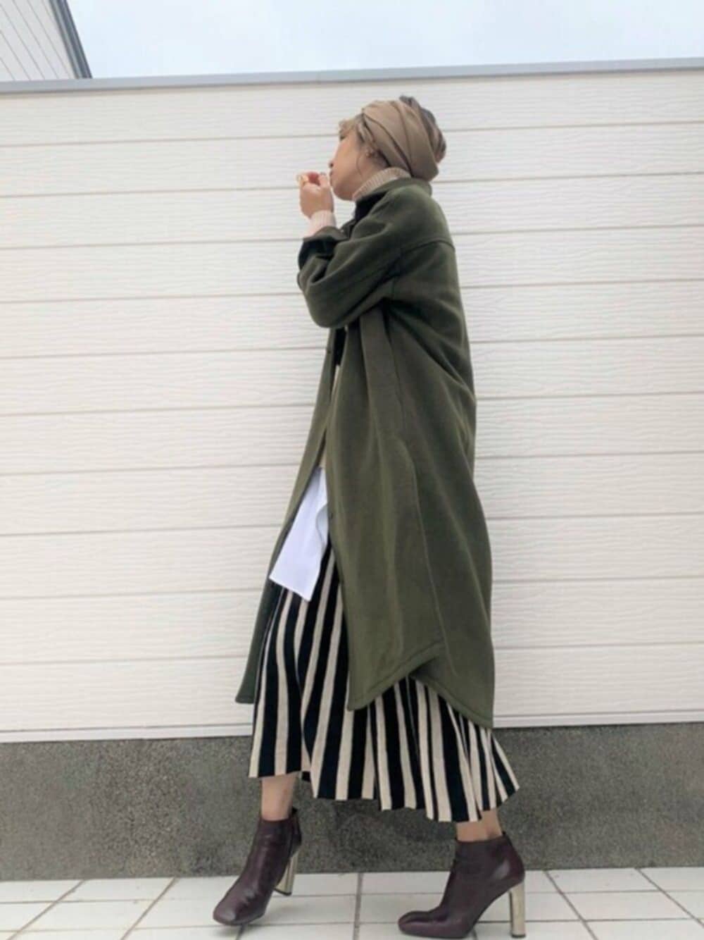 秋冬定番カラーのカーキのアウターに、レトロな印象のニットスカートを組み合わせて、オシャレなカラーでまとめました。