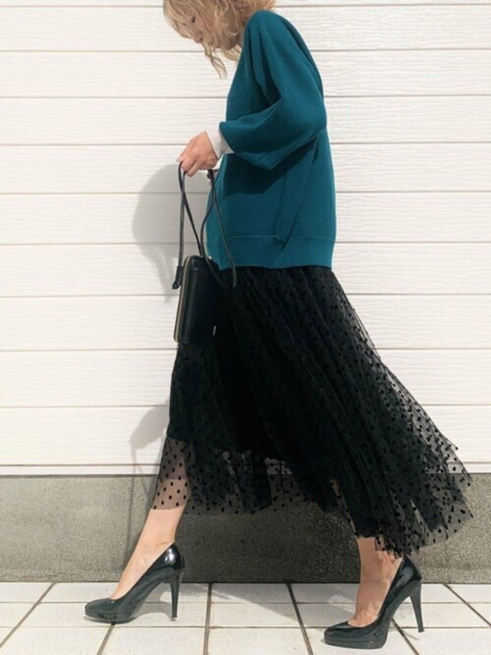 身頃と袖リブのカラーをバイカラーにしたニットを使ってコーディネート