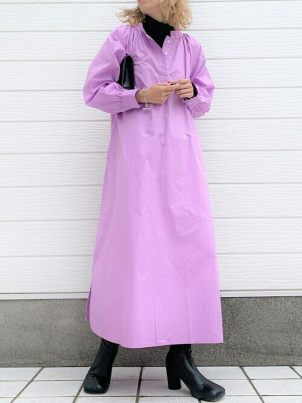 カラーが可愛いシャツワンピースにタートルネックをインナーに合わせた、レイヤードコーデ