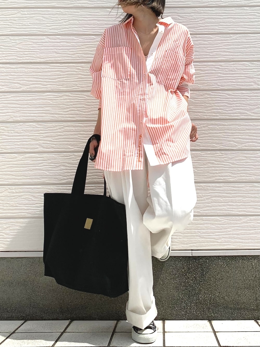 今年大注目のオレンジストライプのオーバーシャツを白パンツ合わせで大人コーディネートに仕上げました ※オレンジはweb限定カラーです