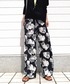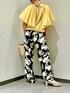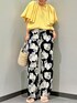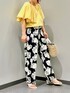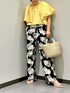イラストちっくなフラワー柄がプリントされたフラワーパンツ どんなお色にも合わせやすいモノトーンですが、柄が大きめなので華やかかわいいアイテムです ふんわり袖のトップスはリネンライクなので着心地さらさら 夏に似合うイエローは着ていて気分が上がります