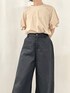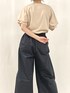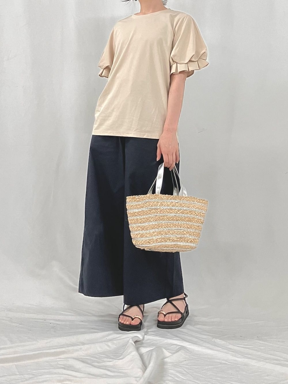 フレア付きのパフスリーブトップス チュールやフレアスカートと合わせても勿論かわいいアイテムに、すっきりめのワイドストレートパンツを合わせました 落ち着いたベージュの色味はデニムとも相性抜群 ネイビーのパンツはTシャツやブラウスとも似合うので、どちらも着回ししやすいアイテムです
