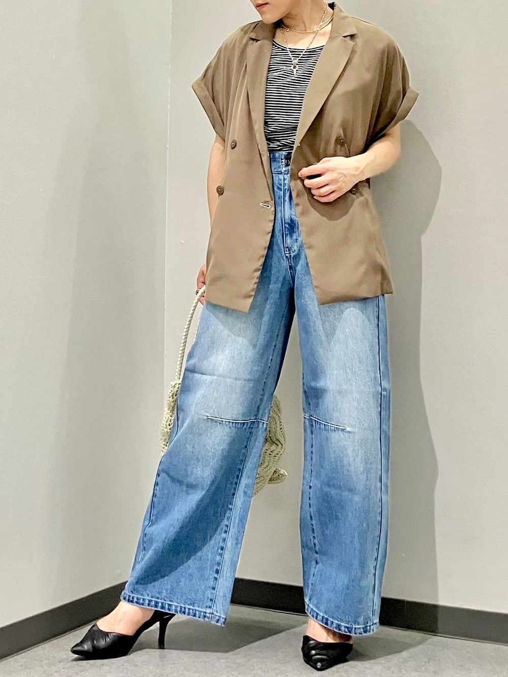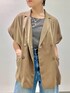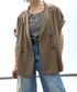 オリジナルボタンを使用したジレジャケット 上品ながら柔らかいカジュアルさがあるアイテムです 合わせるお洋服によってシックに着ることもできちゃいます ボタンホールや留め糸の淡いパープルがアクセントです