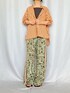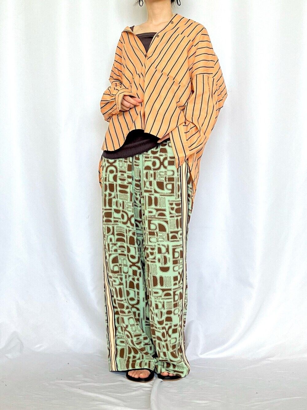 喧嘩しがちな柄×柄のコーデ シャツのストライプがパンツのカラーとリンクしてます かなり肩を落として着てますが、シャツ自体もオーバーサイズめ 羽織としてもトップスとしても着やすい形のシャツです もっと合わせやすいホワイトカラーもありますよ