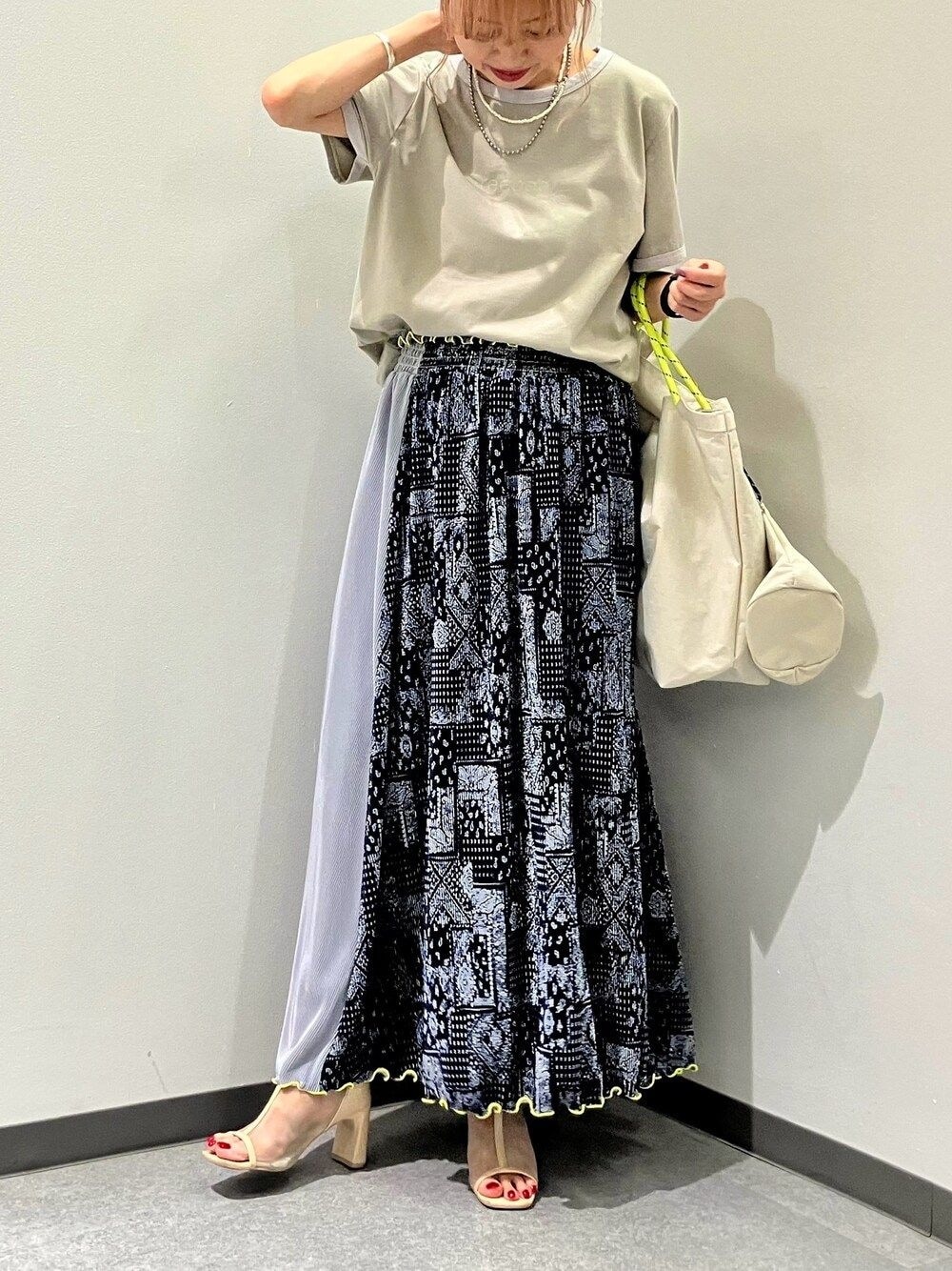 衿と袖のカラーが違うリンガーTシャツ 実は身頃にロゴがプリントされてます シンプルなので何とでも合わせやすいアイテムです マキシ丈のプリーツスカートは柄と無地のドッキング 前後左右斜め、お好みの具合で着られます ウェストと裾にカラーラインが入っているのもかわいいポイントです◎