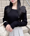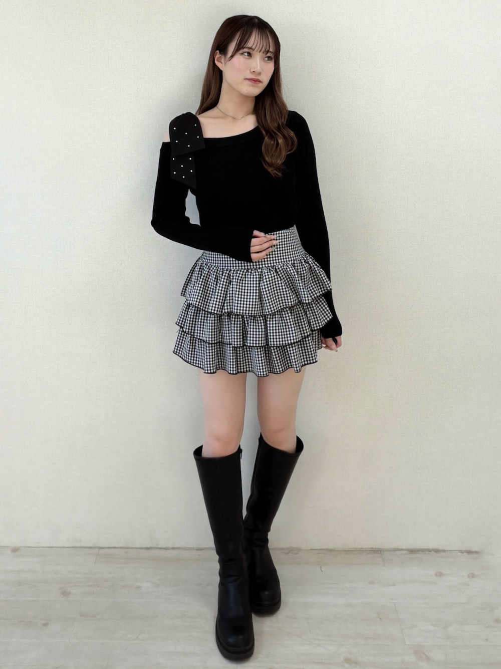 INGNI定番のワンショル肩リボンニット!今季はビジュー付きで更に可愛くなりました~🥺 INGNIのワンショルは開きすぎることなく程良い為、普段肌見せ苦手な方などにもおすすめです❣️◎ トレンドライクなギンガムチェックのフリルスカパンと合わせて、がっつり甘めコーデ完成です⸝⸝꙳ ガーリー好きさんにおすすめのコーディネートです🥺💕ぜひ参考にしてみてください🪄