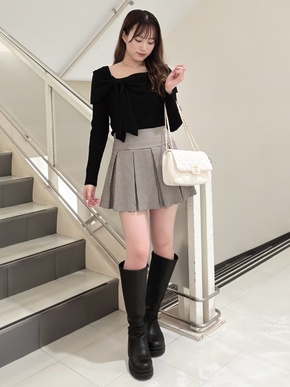 大人気INGNIのリボンオフショルニットが更に可愛くなって春物アイテムとして入荷しました🪄 今回もリボンの紐の部分は取り外し可能で、2wayなのが有難い🥹 ブラウンチェックのスカートは季節問わず大活躍で、春コーデにもぴったりのアイテムです!✨