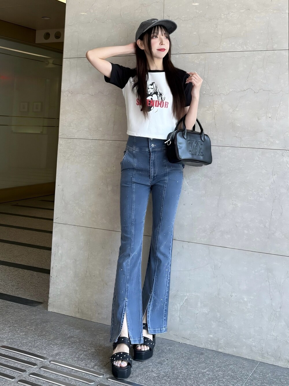 コンパクトなサイズ感が使いやすいカジュアルT🪽🖤 フロントのガールロゴとラインストーンデザインが映える1枚です✨ トレンド好きの方におすすめのアイテム🙆♀️ パンツはストレッチ性抜群のフレアデニム🫐 チビTに合わせやすいハイウエスト仕様になってます🫶 裾にはスリットが入って抜け感の出るパンツです🙌🏻