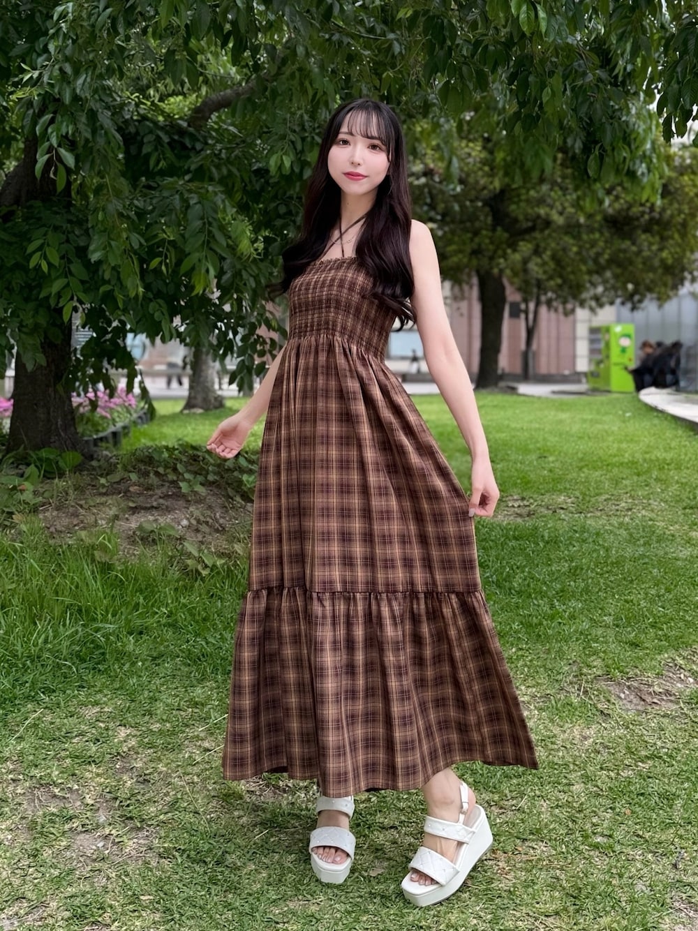 nao(INGNI 天神ソラリア店)のワンピース「ホルターネックチェック柄シャーリングワンピース/A」を使ったコーディネート