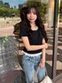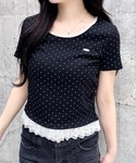 トレンドのドット柄トップス🥹裾と首周りのレースがガーリーな甘さをプラスしてくれます🎀 胸元についたプレートがアクセントに🙆🏼♀️ 甘めなトップスにはデニムでカジュアルダウンさせるとより今年っぽいコーデになります🪽✨