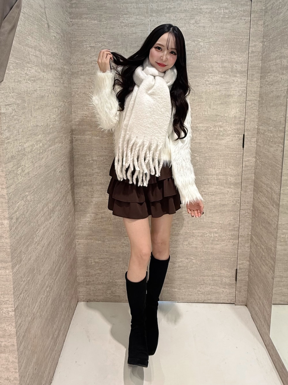 冬に映えるホワイトアイテム🐻❄️ 大人も使いやすい毛足の長いシャギーニットは季節感たっぷりで着回しの幅も広いおすすめニットです🤍 毎年大人気のマフラー今年も入荷してます🥹