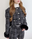 キラキラのラメがアクセントになったツイードジャケット✨同柄のショートパンツもあるのでセットアップもできます🖤 袖ファーは取り外し可能なので色々なシーンで活躍するおすすめアイテムです🎀 インナーにはハイネックトップスやブラウスを入れるのも🙆🏼♀️