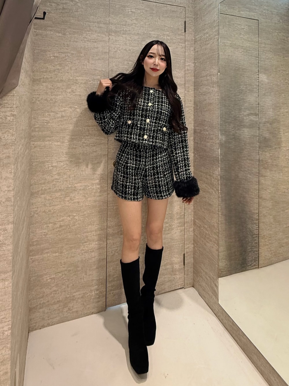nao(INGNI 天神ソラリア店)のノーカラージャケット「袖口エコファーツイードジャケット(セットアップ対応)」を使ったコーディネート
