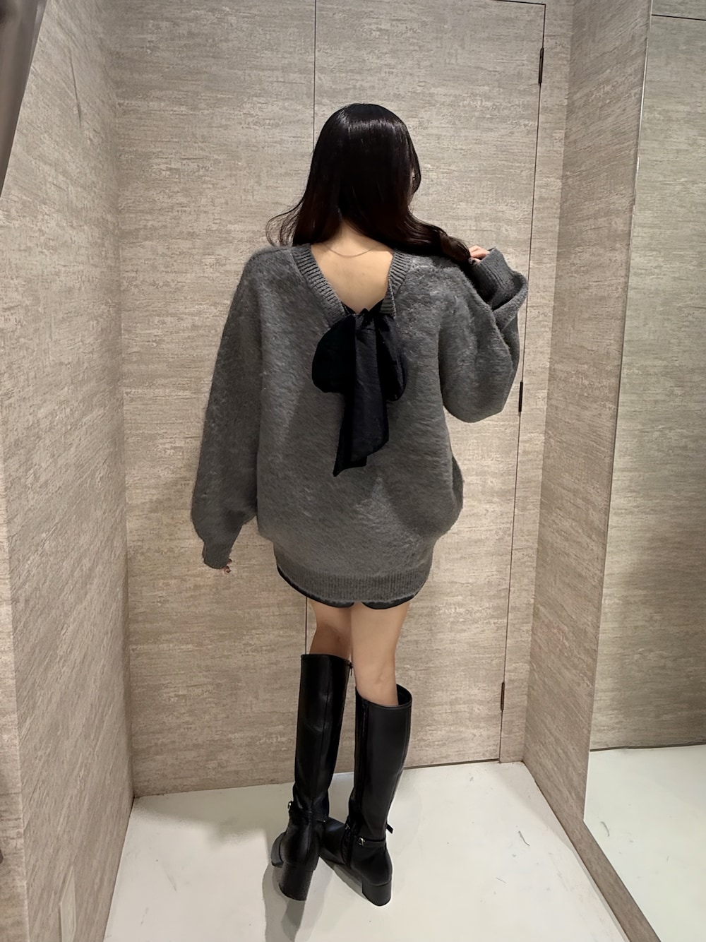 大人気のバックリボンニット🖤 大人可愛いチャコールカラーおすすめです🫶🏻 リボンはベロア素材でクラシカルな印象に✨ とにかく後ろ姿が映えるおすすめニットです! ふわふわのシャギー素材が気持ち良い🥹
