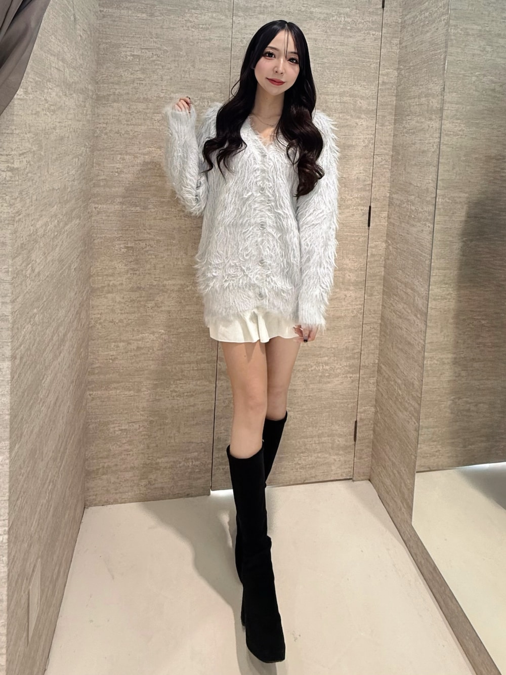 毛足の長くて大人っぽさ、上品さも兼ね備えたシャギーカーディガン❄️青みがかったライトグレーの色は肌のトーンも明るく透明感もアップ🤍 ミニボトムと合わせてダボっと感を強調するとあざと可愛いく着こなせます☺️🎀