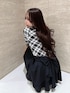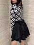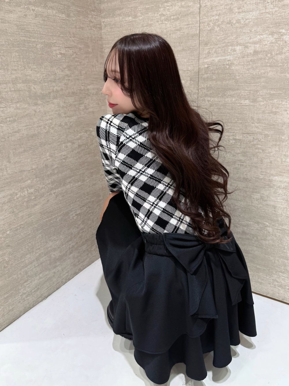 後ろ姿がとんでもなく可愛く盛れる新作のBackリボンスカート🎀ブラックのスカートにモノトーンチェックのトップスを合わせてフレンチガーリーなコーデに❄️ トップスも店頭大大大人気の売れ筋アイテムです🤍