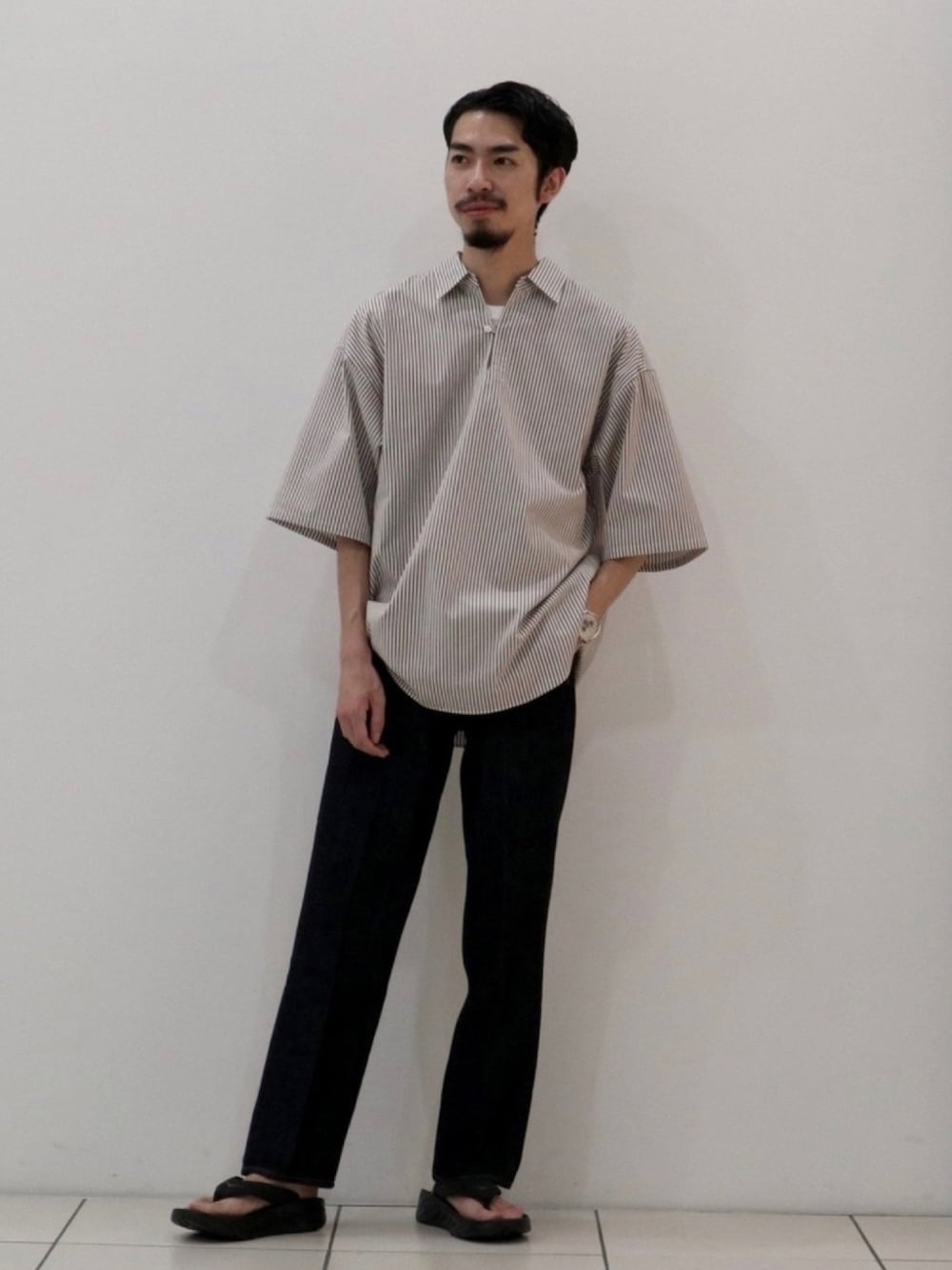 【サイズ感】 アームホールや身幅が広くとってあるので、Mサイズでも十分なサイズ感です。 【素材感・着心地】 コットン100%のブロード素材。 着心地もコットンの柔らかい素材感とサイズもにゆとりのあるのも相まってリラックスして着用出来るアイテムです。