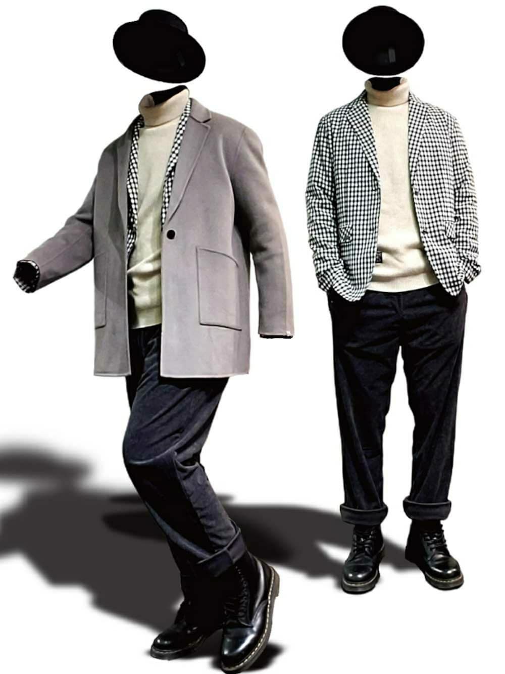 「コート+短丈アウター」 藕灰色中長版大衣內搭嘉頓格紋西裝外套,為早春搭配增添新鮮感。 以灰色為基調的溫柔造型,增添清爽有品位的氣息。可以單穿的西裝外套,內搭高領羊毛針織衫,會更加顯眼。