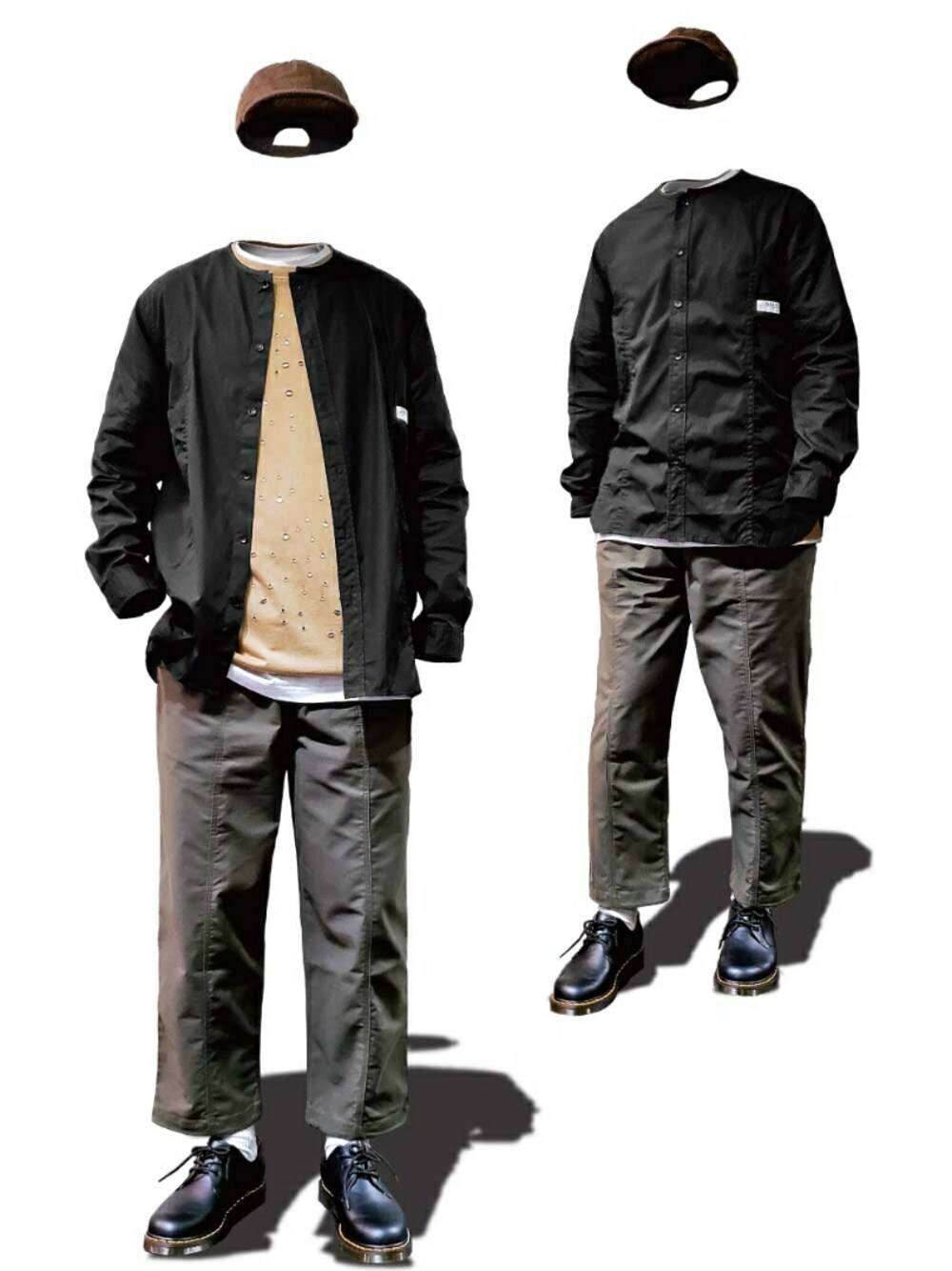 「異中求同的平衡」 不同種類單品搭配,除了藉由風格與顏色找到整體感,從細節中也能找到協調,選擇相同的梭織布面料,以及上下身皆使用包骨車縫工藝,串聯了整體的設計感,也是種不錯的搭配思維