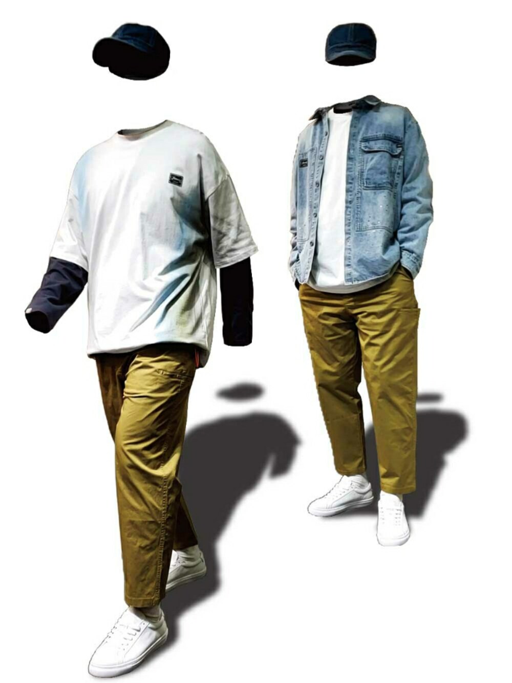 「簡約俐落的輕鬆感」 寬鬆的褐色錐形長褲,帶出了色系的主軸,上身使用了潑漆效果的牛仔襯衫協調棕色系的休閒感,內搭的 漸層白色T-shirt與白鞋,讓整體的視覺明亮了起來,有著清爽俐落的輕鬆感