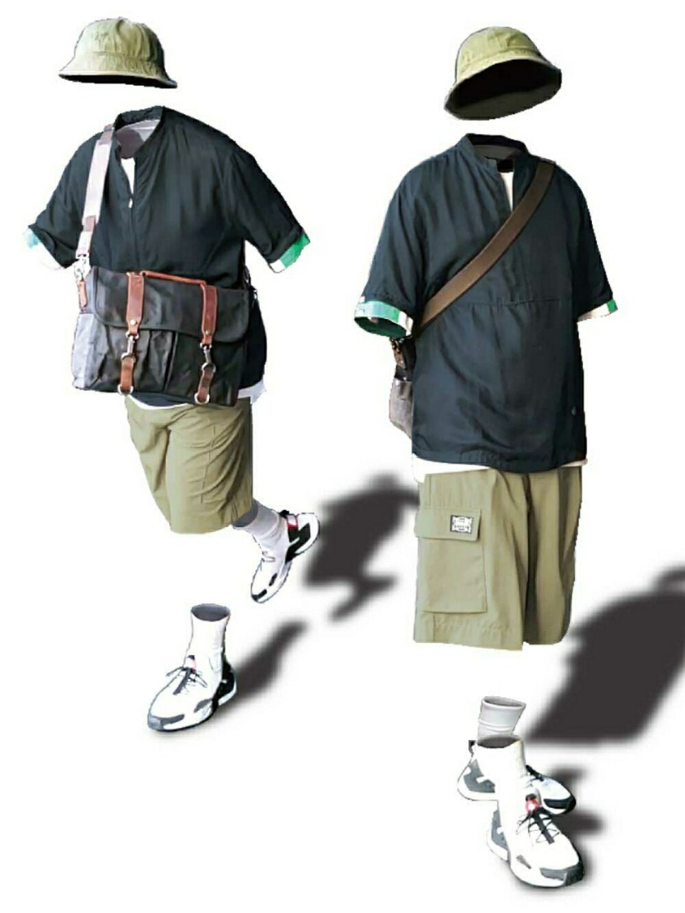 「用綠色為黑色注入生氣」 帶有光澤感的短袖襯衫,加入現代感的綠色元素T-Shirt,讓黑色的基調更生動有趣。搭配草灰綠短褲和漁夫帽,營造出色彩呼應的夏季都會風格。