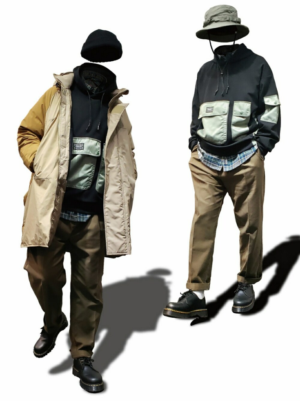 「低調的秋冬暖色調搭配」 以茶褐色壓褶長褲與低調的黑色帽T為基礎,而帶有軍綠拼貼口袋的帽T恰好作為點綴的過渡色,外搭上撞色卡其長版羽絨外套,既增添了整體造型的亮點,又為冷冽的秋冬天氣注入了溫暖感,形成衣著的層次。這樣的堆疊創造了一種簡約而從容的個人風格。