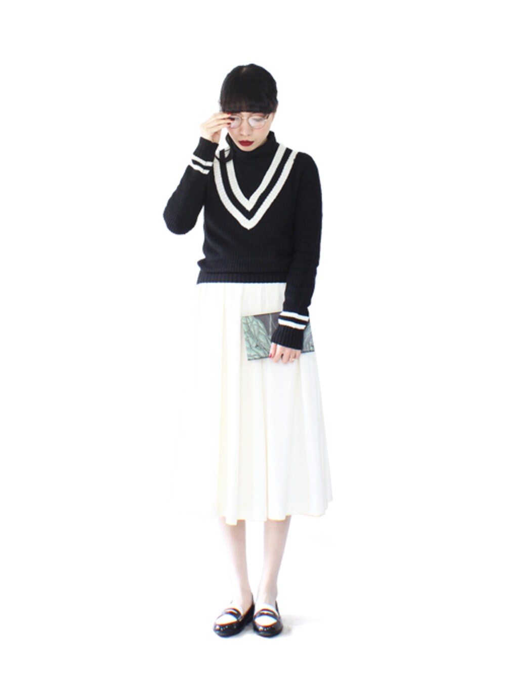ブラック系のニット/セーター、ホワイト系のスカート、ブラック系のその他シューズを着用したレディースの春コーディネートの1枚目の写真