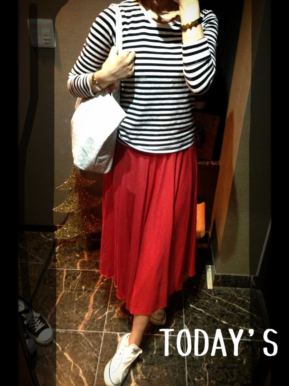 ゆる〜い格好したくて、 今日は赤のロングスカートにしてみました〜! うーん、楽チン(∩´(エ)`∩)♡♡ トップス/セントジェームス スカート/不明? スニーカー/コンバース