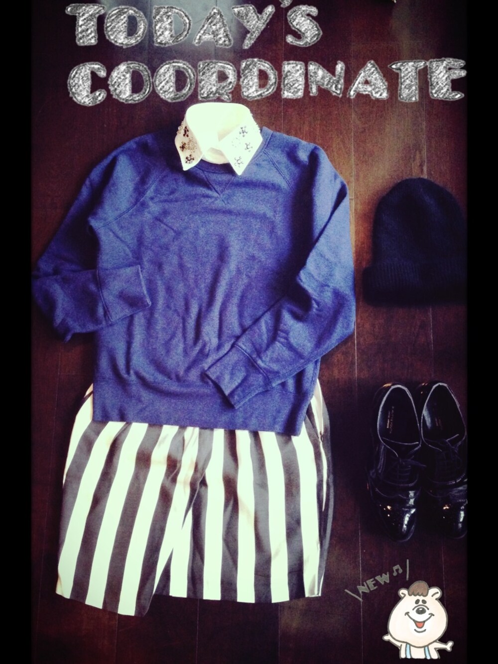 ストライプスカートがボーイッシュだから、ビジュー付きつけ襟でちょっぴり女子力プラス....♡♡♡ スウェット/UNIQLOメンズ ストライプスカート/ZARA