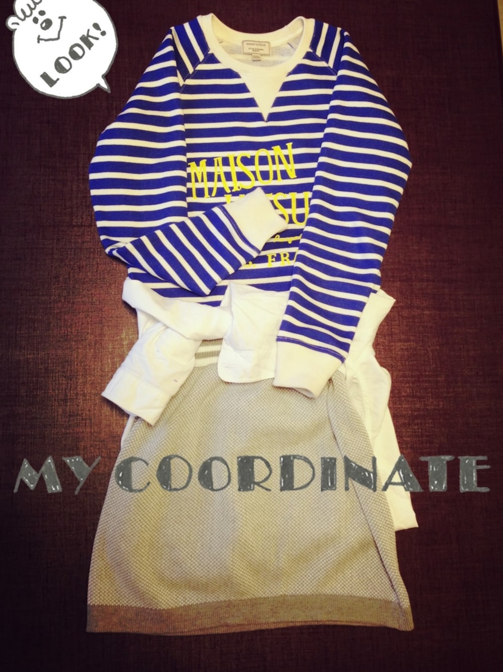 お気に入りのKITSUNEのボーダースウェットで♡ 腰に白シャツを巻いてみました! トップス/メゾンキツネ(ユニセックス) スカート/gu シャツ/UNIQLO