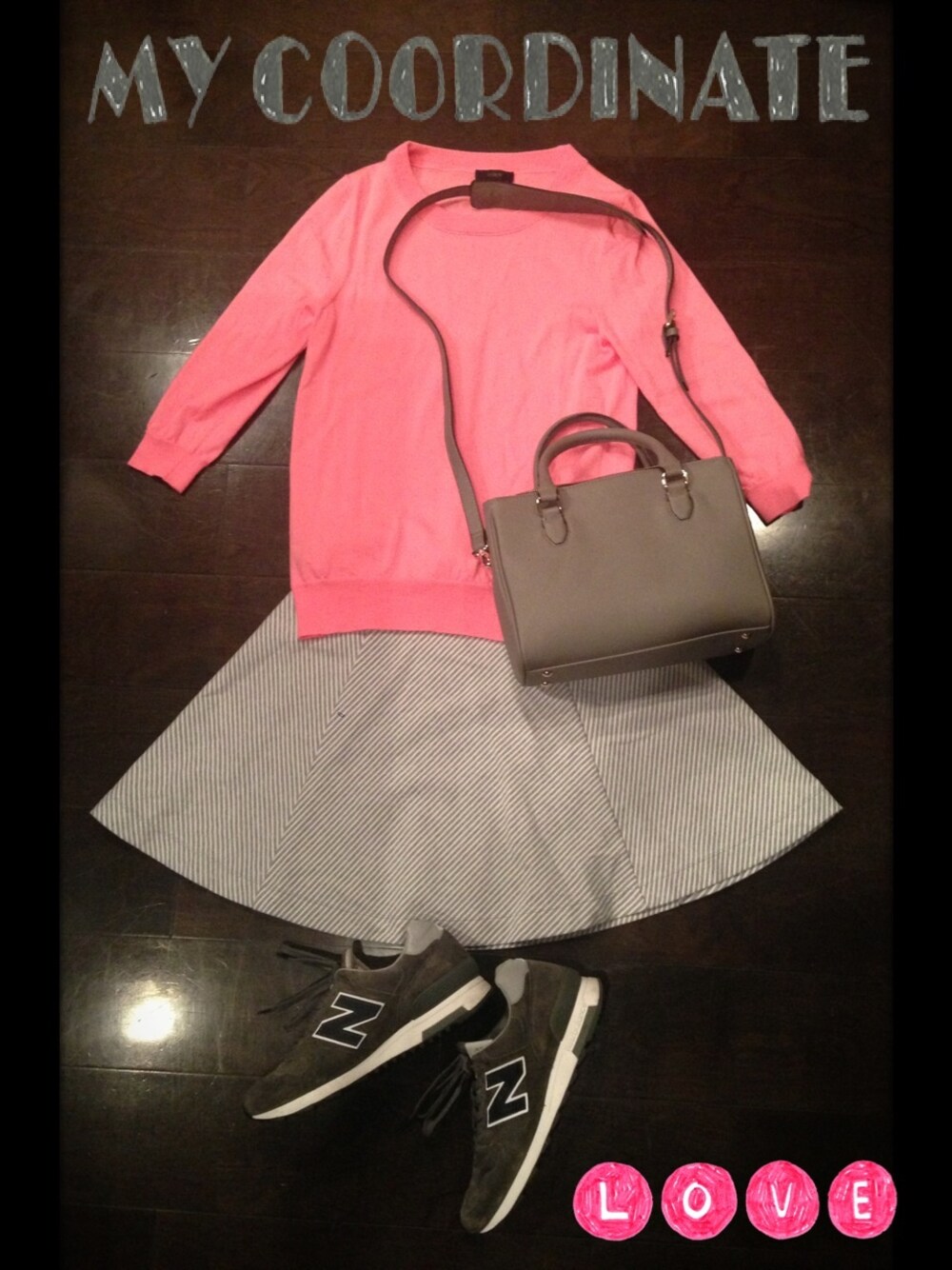 ななめストライプのサーキュラースカート♡ 春らしく、明るい色が着たくて、ピンクニットと合わせてみました〜(∩´(エ)`∩) ニット/J.Crew スカート/UNIQLO バック/ZARA スニーカー/ニューバランス1400✖J.Crew