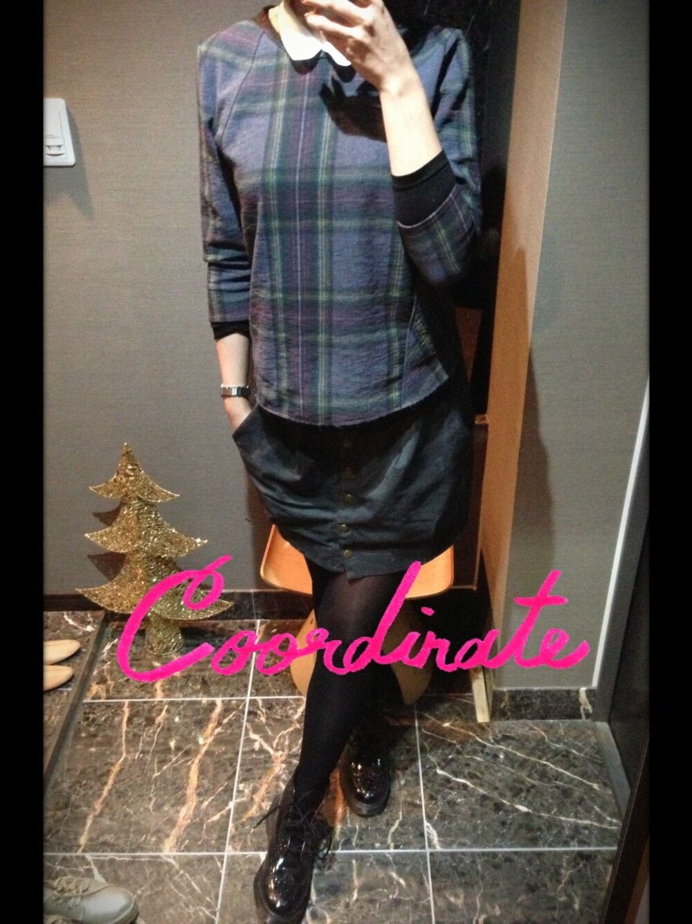 グレーのチェック柄チュニックはZARAのもの♡ 自分の中のはやりの丸襟コーデにしてみました(∩´(エ)`∩) トップス/ZARA スカート/? シューズ/Dr.マーチン