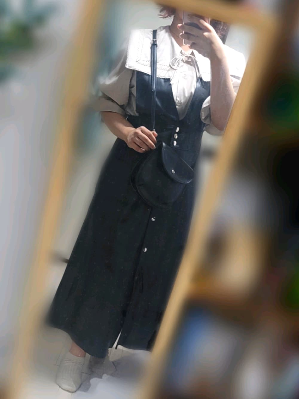 今日は過ごしやすい天気でした☀☁ 大きめ襟のブラウスとレザーを合わせて甘辛ミックスなコーデにしてみました😊