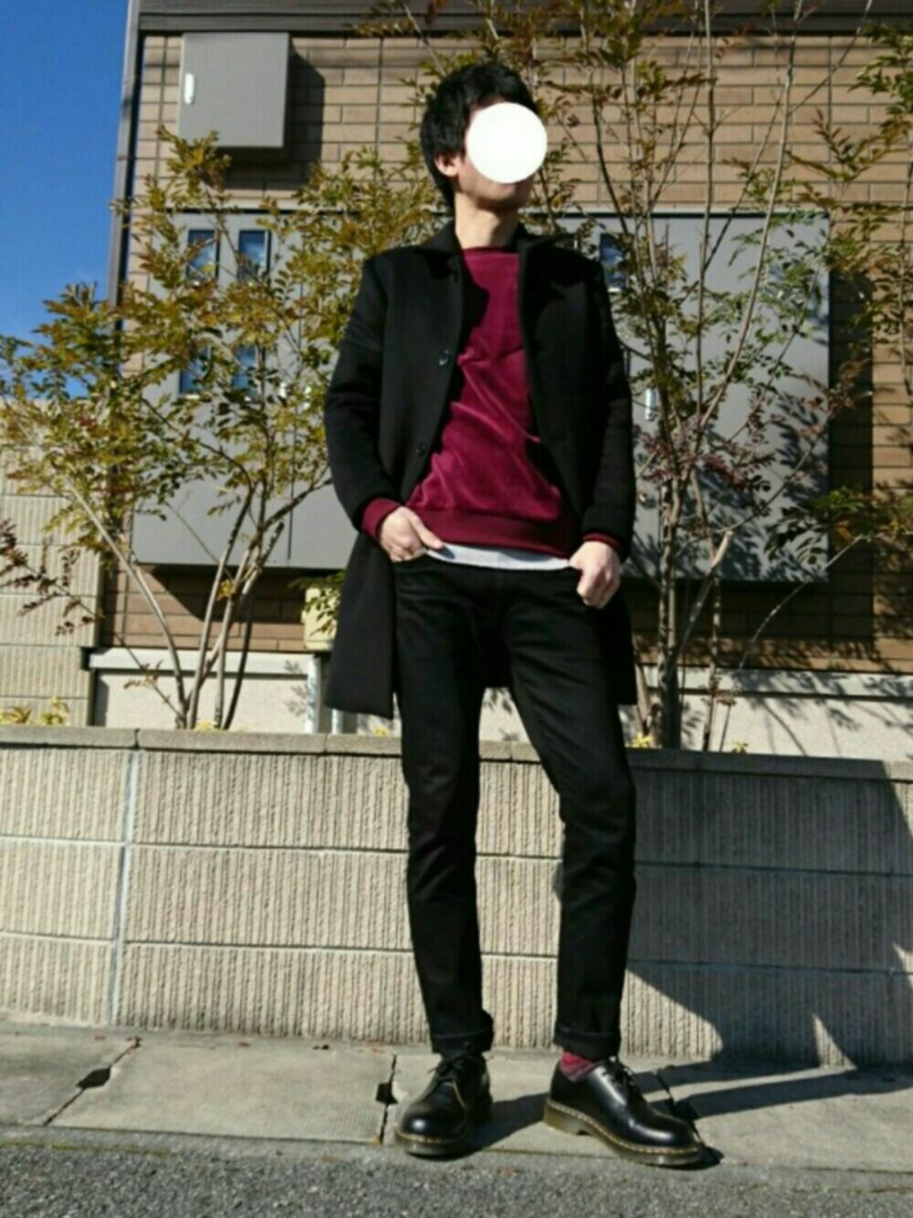 いつも👍 セーブ フォロー コメントまで ありがとうございます(^-^) 今回もお気に入りのステンカラーコート を着用してみました😄 ブラック多目ですがトップスに ワインレッドのベロアスエットを 挟んでアクセントに!