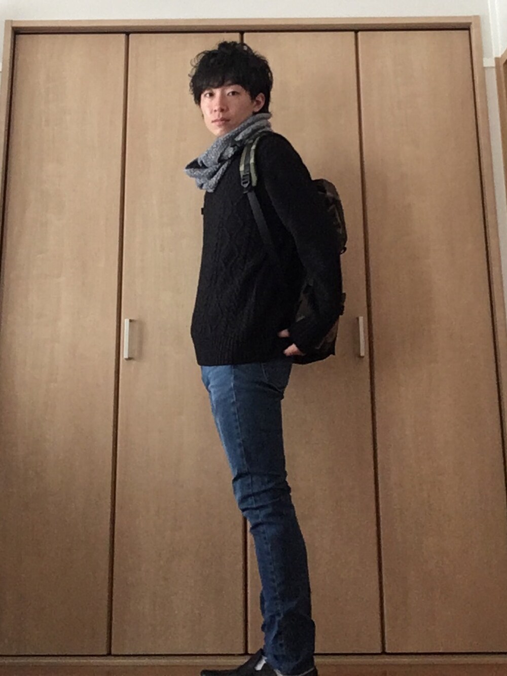 九州男児:0001号のストール/ショール「アクリルケーブルニットスヌード/706052」を使ったコーディネート