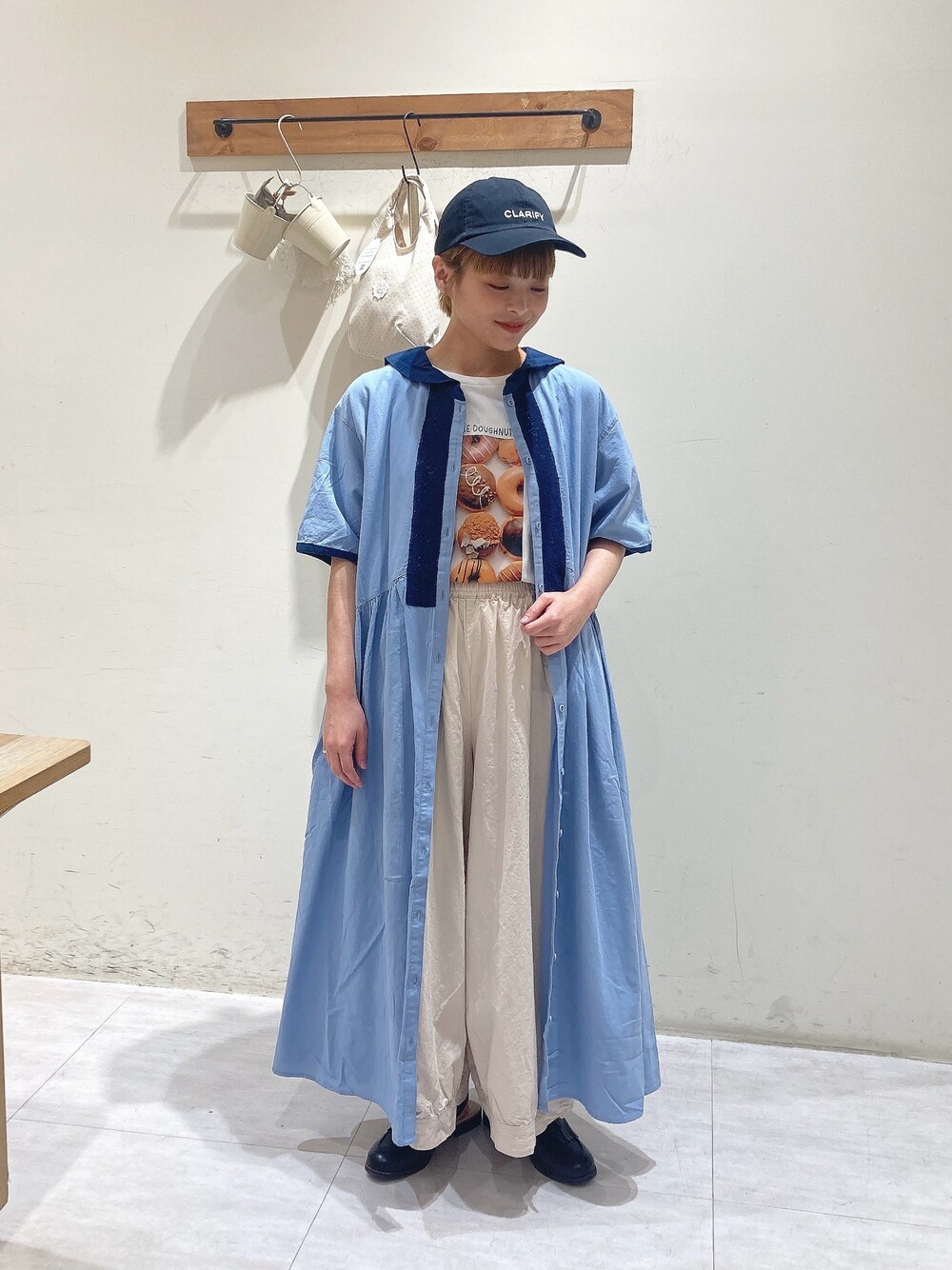セーラーカラーのワンピースで初夏らしいコーディネートにしてみました! ポイントは、ドーナツ柄のTシャツ🍩 1枚で着ても、インナーにしてもアクセントにバッチリ👏 ワイドパンツのシルエットもかわいいので、ワンピースを脱いだスタイリングもおすすめです!