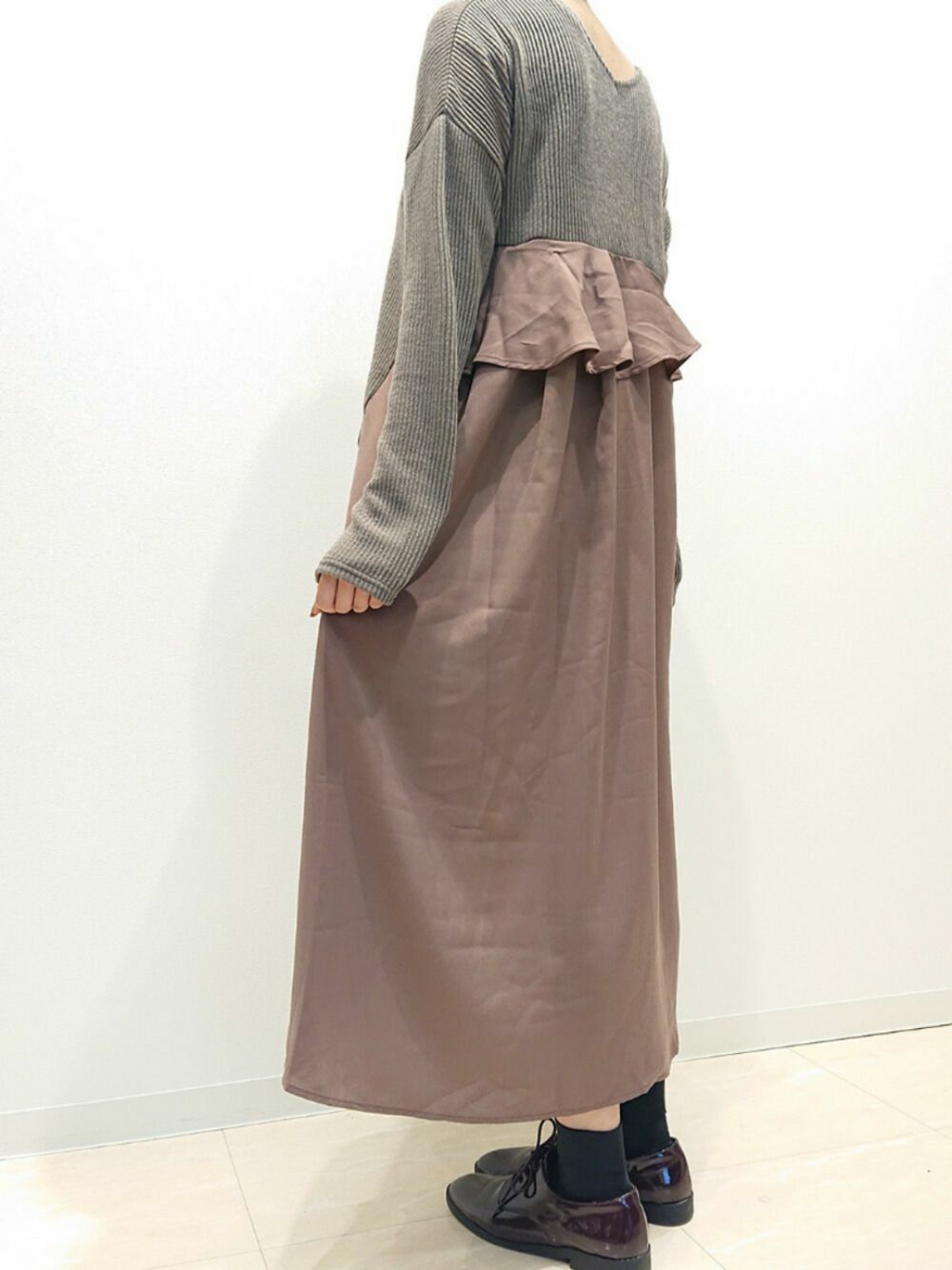 堺北花田INTERPLANETのワンピース「【WEB限定】リブニットソーBACK異素材切替フリルワンピース」を使ったコーディネート