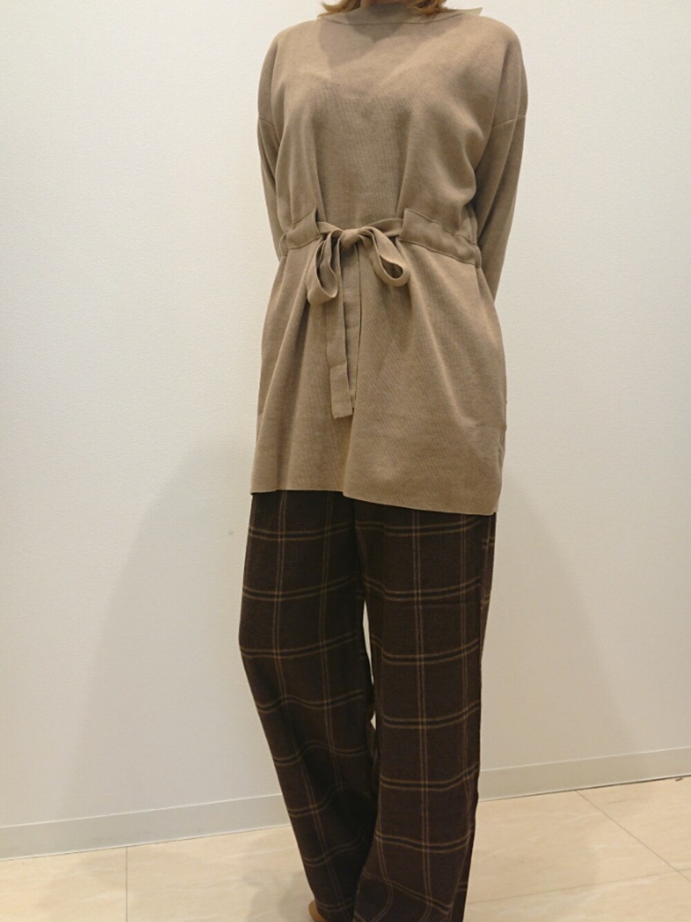 チェックパンツを主役にウエストリボンのニットを合わせてみました。 パンツは太すぎず細すぎずのラインです。 ニットは縛る事ができるので、脚長&細身えできるニットです。 モデル身長 161センチ