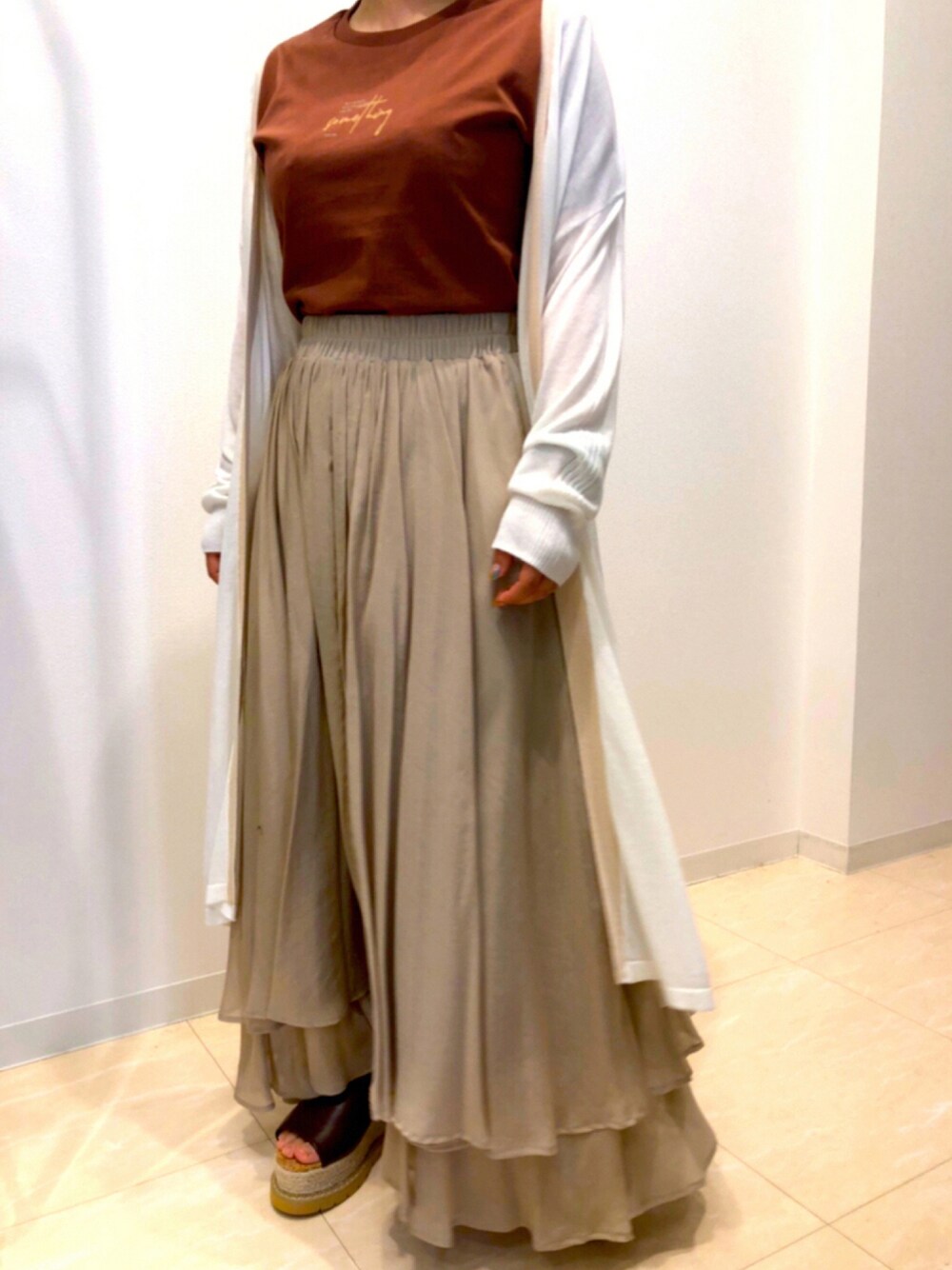 いつも見て頂きありがとうございます🌟 コットン100%のTシャツとフェミニンなスカートに似合う縦ラインが決め手のバイカラーロングカーディガン❤️ モデル身長152㎝
