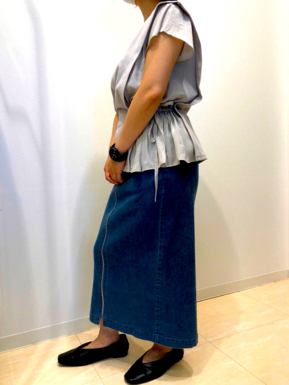 いつも見て頂きありがとうございます✨ トップス→ブラウスとカットソーのミックスがかわいい💕 スカート→シルエットをきれいに見せてくれるシンプルデニムスカート💕 モデル身長152cm