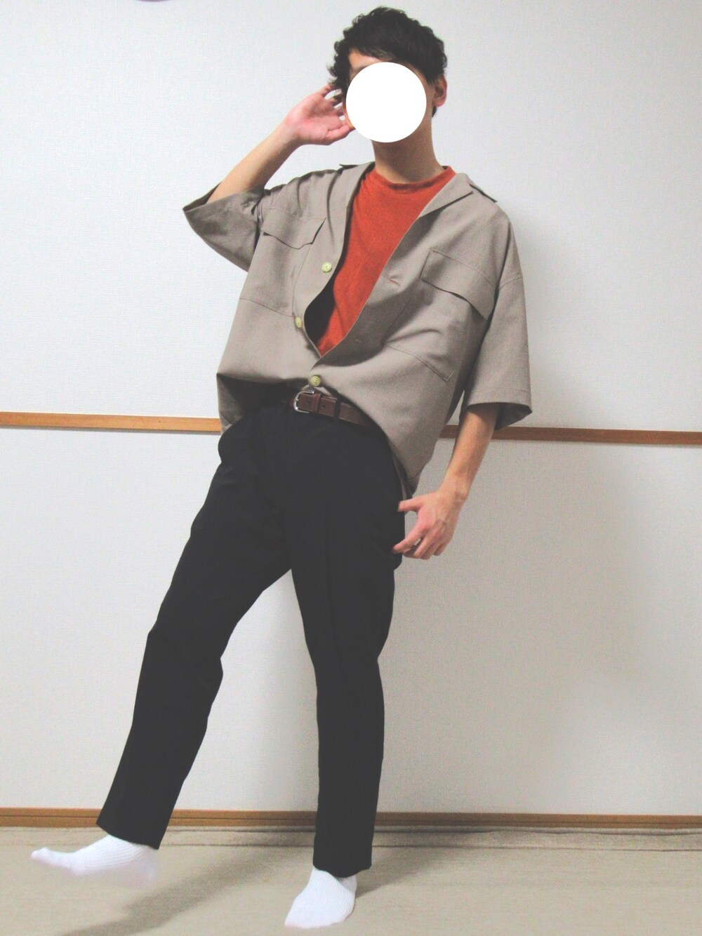 オレンジ系のトップス、ベージュ系のトップス、ブラック系のパンツを着用したメンズの夏コーディネートの1枚目の写真