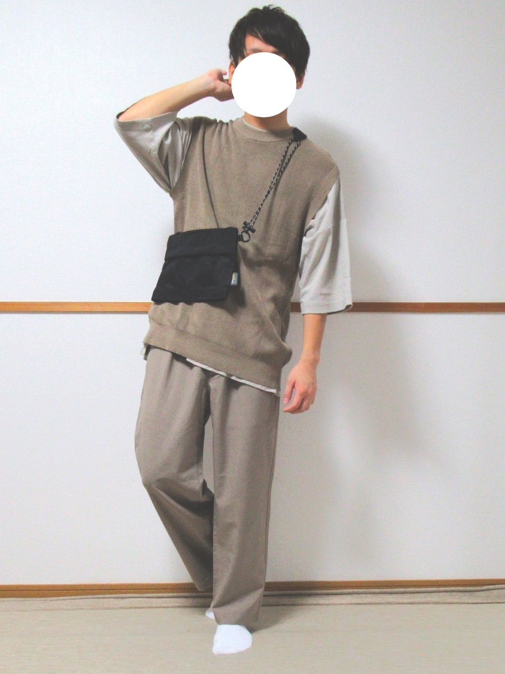 グレー系のTシャツ/カットソー、ベージュ系のベスト、ブラック系のバッグを着用したメンズの夏コーディネートの1枚目の写真