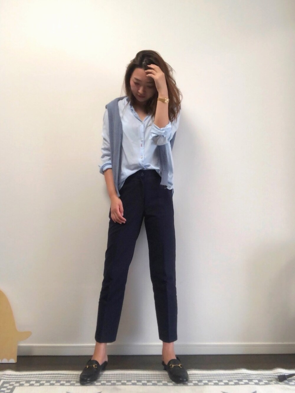 お仕事day ブルー系にまとめることで、爽やかコーデに。 アクセサリーはゴールドで統一感を。 シルバーも好きだけど、ゴールドの方が優しく見えます。 この間購入のGUCCIのかかとを踏んで ひと匙の抜け感をプラス。