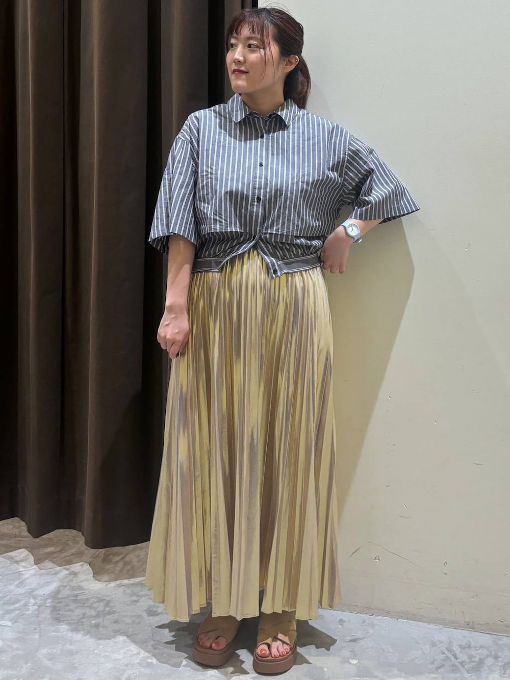 新全身リアルバイコーデ¨̮⃝¨̮⃝ キチッとしたシャツ風のアイテムは ボタンがあってゴムがワンポイントの 可愛いアイテムですꔛ♡ Lサイズ着用してますが 丈感短めでゆったり着れてオススメですよ- ̗̀𖤐 是非お試しくださいね♩