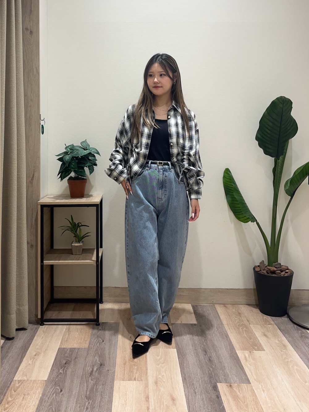 ⚫︎カーブデニムパンツ 腰回りをカバーしてくれる美脚シルエットで、スタイルアップできるデニムです👖 デニムなのに、柔らかく動きやすい生地感なのでストレスフリーです🙆♀️ 滑らかなカーブなので、何にでも合わせやすいです! 154cmの私で、ヒールを履かなくても引きずらない長さです! ⚫︎︎【UV加工付き】ドロストチェックショートシャツ UV遮断率80%! スタイルアップ効果も期待できるトレンド丈になってます! 絞り具合で雰囲気を変えられるので好きなスタイルが着られます🙆♀️ カジュアルながらも大人っぽい印象を与えてくれて、1着としても羽織りとしても活躍するアイテムです! ⚫︎GLDラインベロアパンプス 上品ベロア素材なので上品な足元にしてくれます! 女性らしい季節感のあるベロア素材で、ゴールドのラインが洗練された印象をプラスしてくれます◎ 足先を美しく見せるポインテッドトゥデザイン となってます🌟 23.5cmの私は、Mサイズだと少し大きいです。