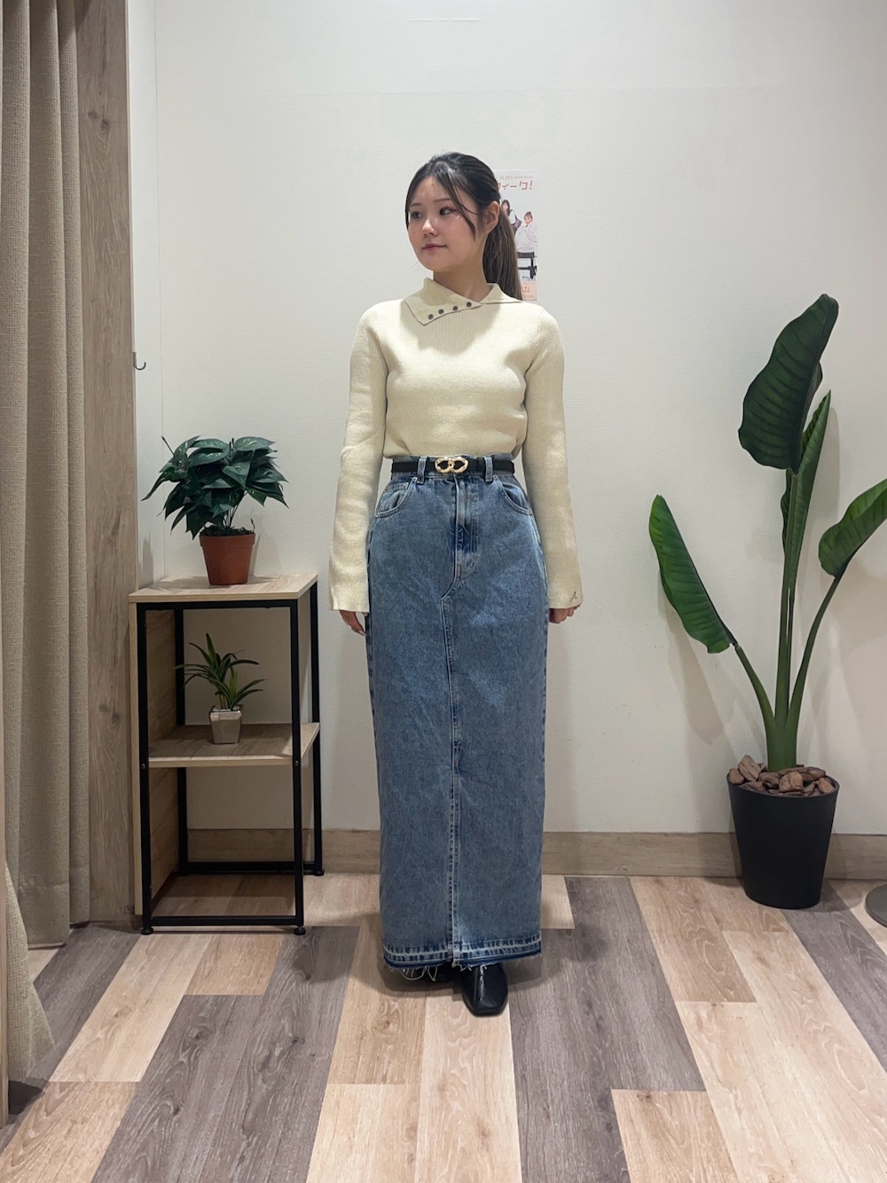 ニットとデニムの合わせってとっても可愛い💕 このニットはキラキラしていて、シンプルな合わせでもおしゃれに見せてくれます🎶 首元にデザインがあるので、おしゃれポイントになっています! スカートは、前にスリットが入っていて、まっすぐなラインなので、スタイル良く見せてくれます☺︎