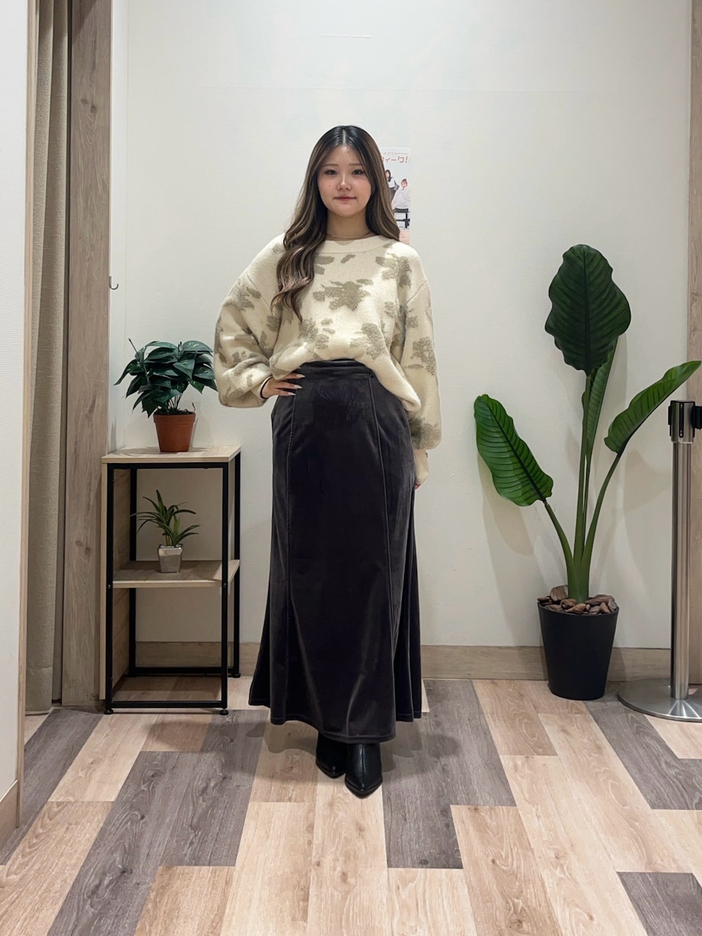 ベロアスカートで季節感を感じられます! マーメイドスカートになっていて、骨盤をカバーしてくれるので、気にせずに切ることができます🙆♀️ 後ろにスリットが入っているので、歩きやすく後ろからもキレイに見えます!