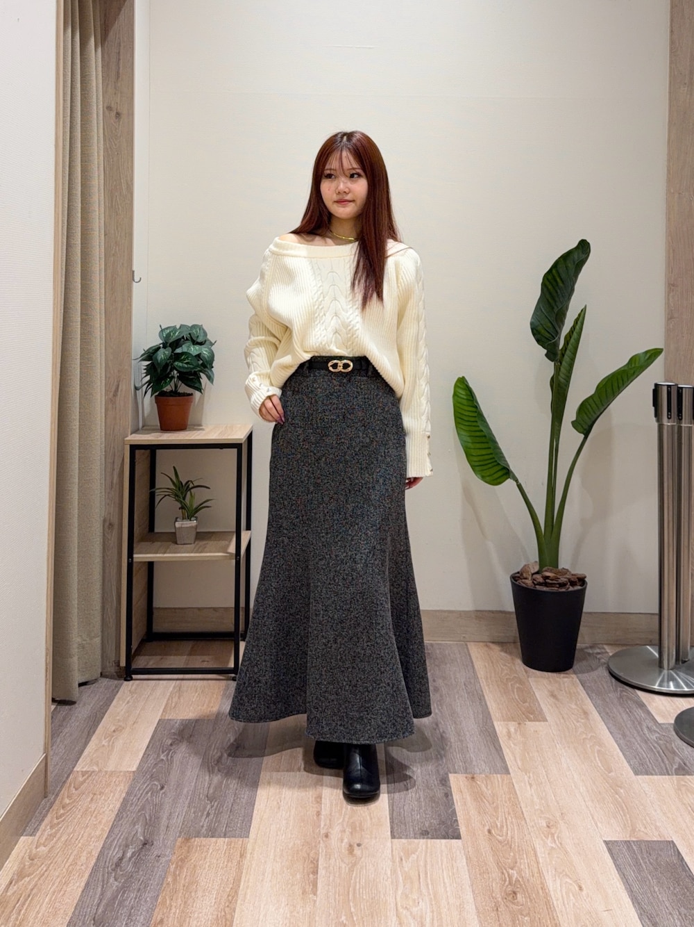 オフショル、ワンショルにできる3wayのケーブルニット♡ コーデやその日の気分に合わせて変えられる万能ニットです! 生地がしっかりしているので、冬でも暖かく着れます! ツイード柄のマーメイドスカートは、形がキレイで骨格ウェーブの気になる骨盤をカバーしてくれるので、スタイル良く見えるスカートです!