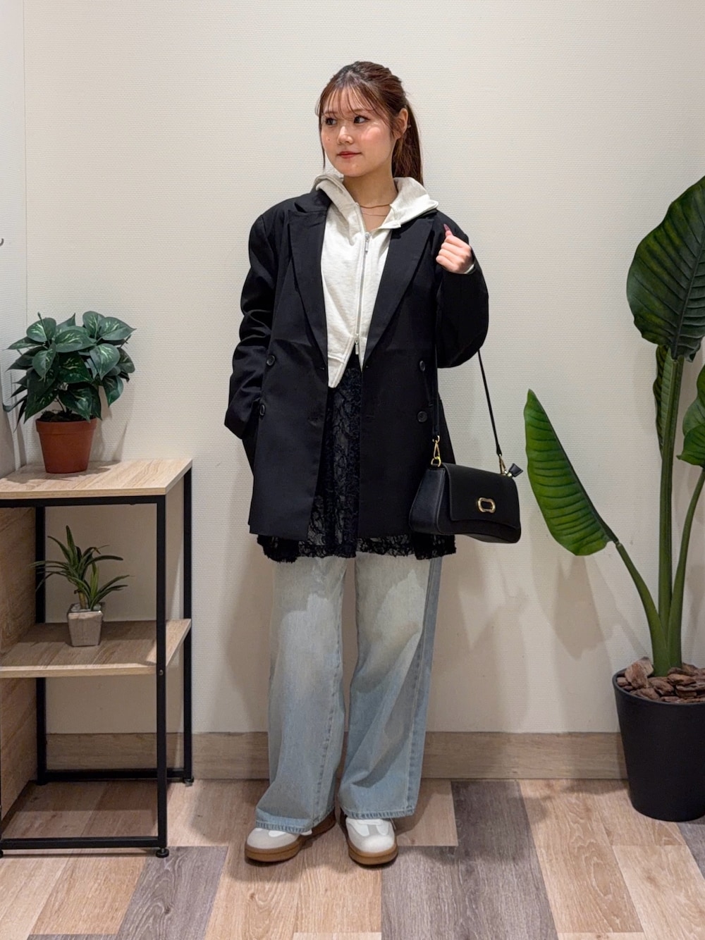 レースチュニックを足すだけで、可愛いコーデに大変身! 肩紐で長さ調節できるので、身長気にせず着られるアイテムです! デニムは、ストレートデニムで形がキレイなので、レイヤードをしても着太りしないです! 154cmの低身長でも引きずらずキレイに履くことができます✨